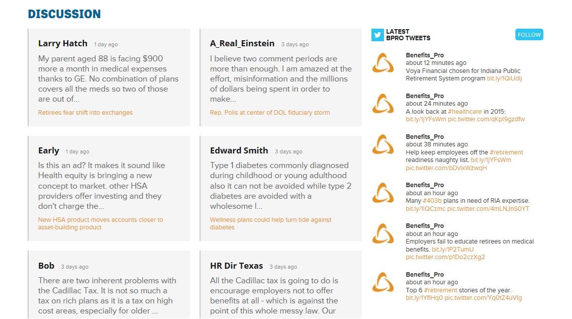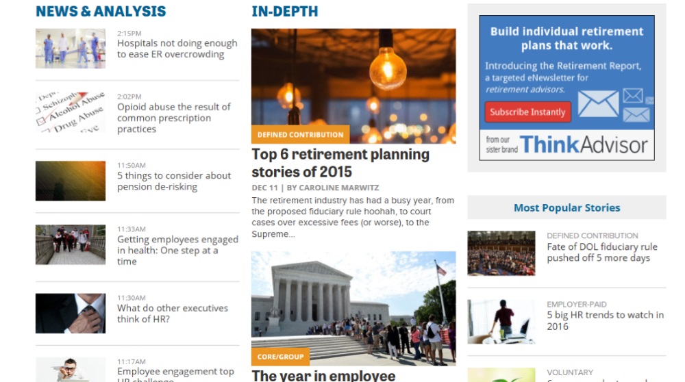 BenefitsPro.com: BenefitsPro.com is the #1 online destination for EVERY benefits professional. Illuminating the complex and ever-changing benefits market, opening the lines of communication and creating community, no other Website is quite like this. BenefitsPro.com is designed to provide benefits brokers, benefits managers and retirement advisors the news, resources and tools they need – FAST. The site combines the established knowledge resources and news reporting capabilities from the experts at ALM’s Employee Benefits Network with proprietary market data and relevant content aggregated from across the Web to create one distinct and vital information source for all employee benefits and retirement professionals.