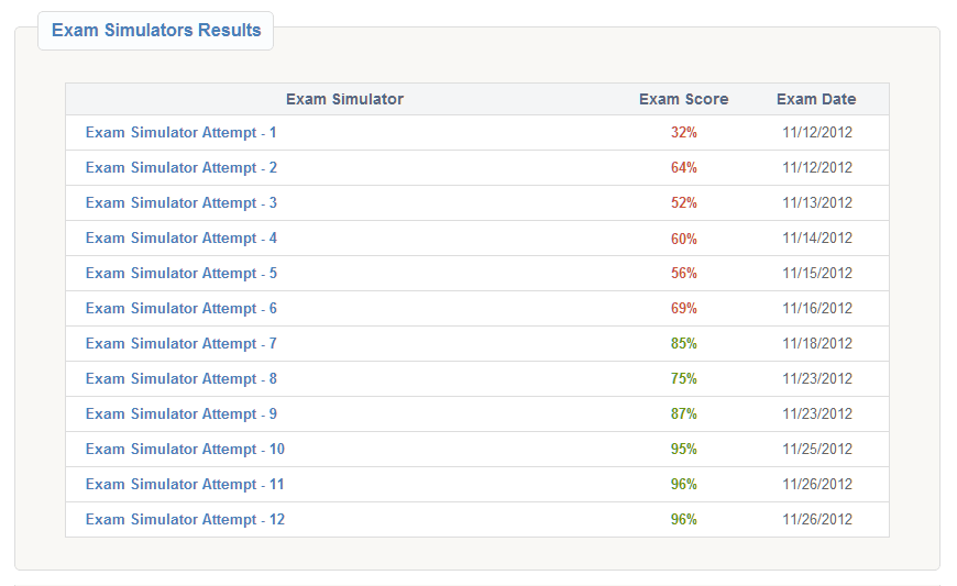 This section allows you to track your practice exam results using our Exam Simulators. Your Pass Report also tracks your course lesson exams as well as your course final exam scores.